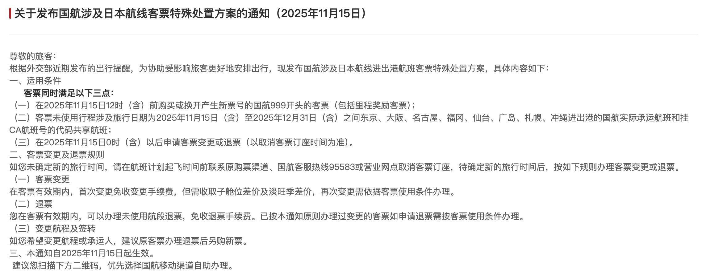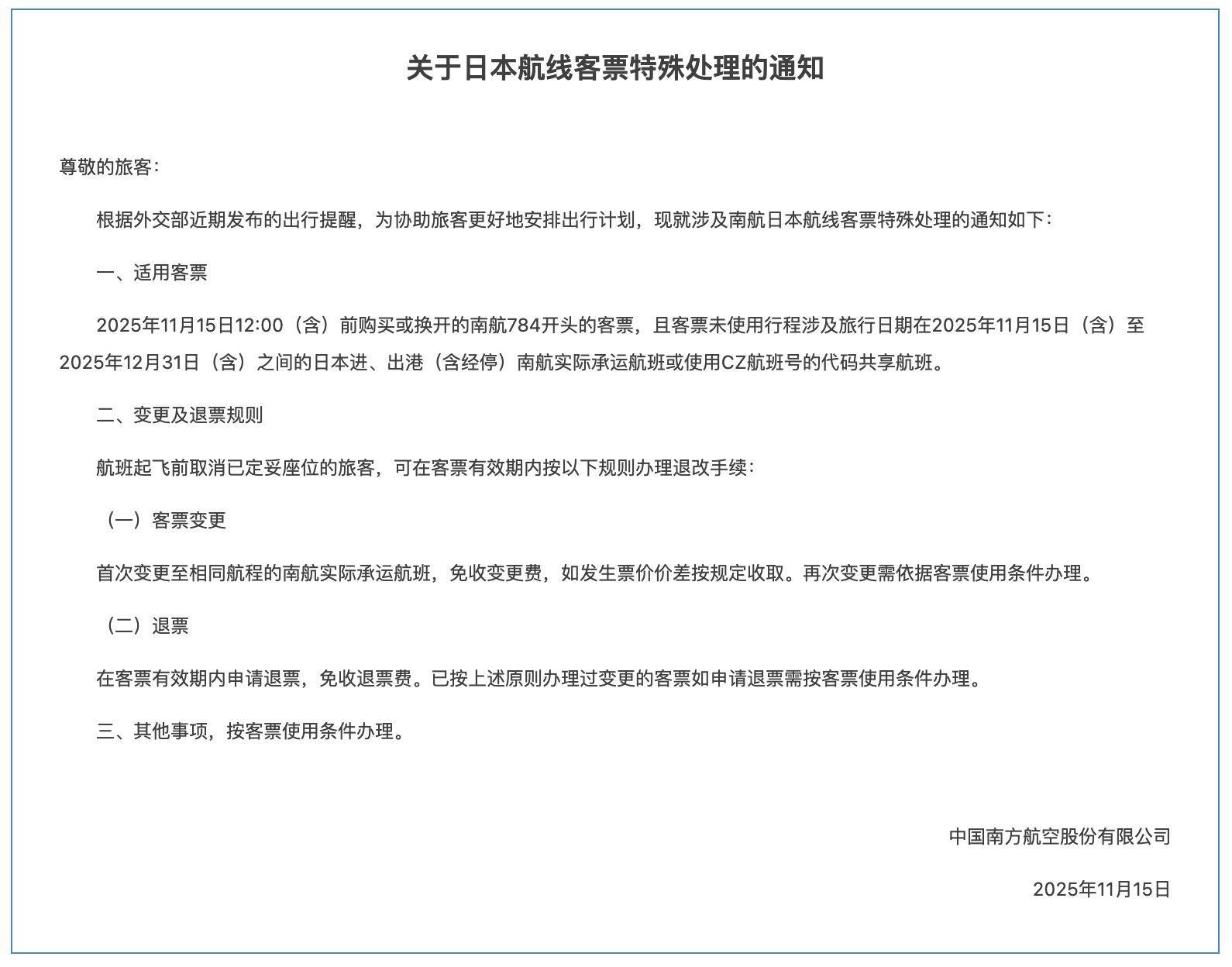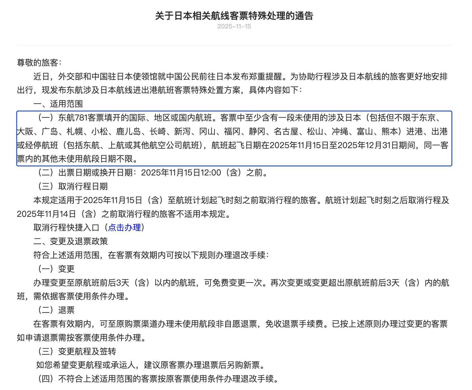 r东航表示,为协助行程涉及日本航线的旅客更好地安排出行,现发布东航涉及日本航线进出港航班客票特殊处置方案,凡客票中至少含有一段未使用的涉及日本(包括但不限于东京、大阪、广岛、札幌、小松、鹿儿岛、长崎、新泻、冈山、福冈、静冈、名古屋、松山、冲绳、富山、熊本)进港、出港或经停航班(包括东航、上航或其他航空公司航班),航班起飞日期在2025年11月15日至2025年12月31日期间的,可免费变更一次,退票则免收退票手续费。